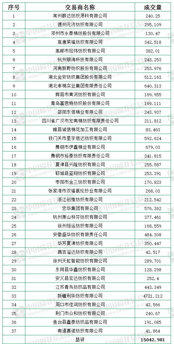 10月8日儲備棉投放銷售資源15042.981噸,實際成交15042.981噸,成交率100%,成交均價20878元/噸,折3128價格22566元/噸?!?/p>