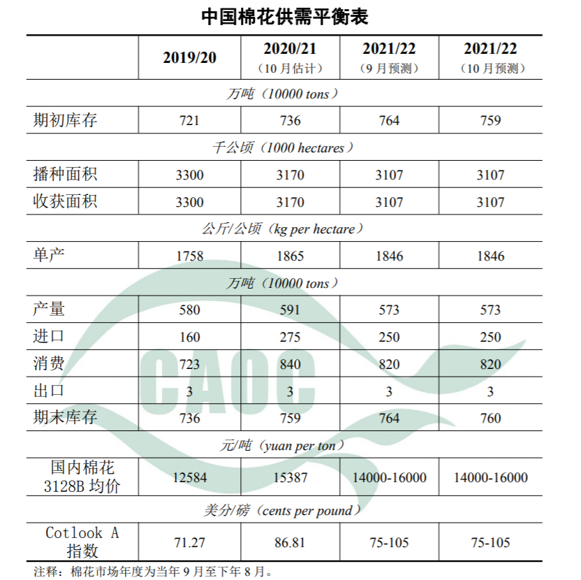 本月估計,截至8月底,2020/21年度我國累計進口棉花275萬噸,較估值調(diào)減5萬噸,棉花期末庫存調(diào)減至759萬噸。本月預(yù)測,全國棉花產(chǎn)量、消費量、進口量維持上月預(yù)測不變。新年度全國棉花進入集中采收期,受新疆棉區(qū)生產(chǎn)前期低溫凍害等極端氣候和黃河流域棉區(qū)收獲期降雨影響,棉花采摘時間有所延后。截至10月8日,全國新棉采摘進度17.2%,同比下降19.9個百分點。9月以來棉價快速上漲,考慮新年度棉花生產(chǎn)基本穩(wěn)定,儲備棉投放進一步加大市場供給,棉花供給總體充裕,棉價存在下行壓力,暫維持上月預(yù)測區(qū)間不變。