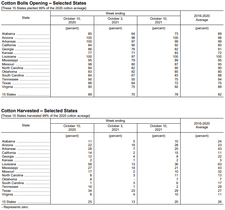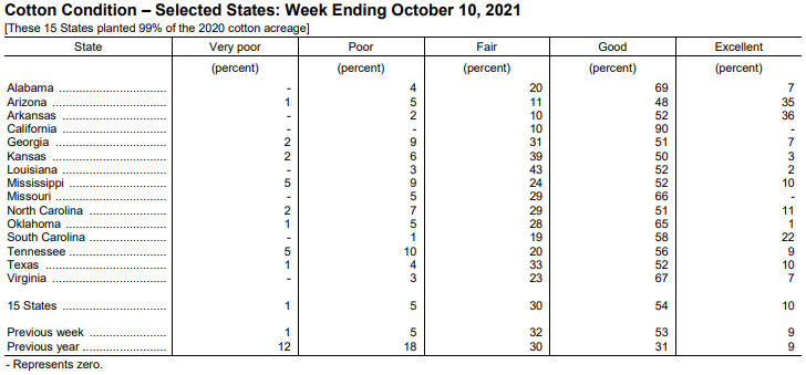 美國農(nóng)業(yè)部10月12日發(fā)布的美國棉花生長報告顯示,截至10月10日當周,美棉吐絮率為78%,前周為70%,去年同期為89%,五年均值為82%。美棉收割率為20%,前周為13%,去年同期為25%,五年均值為26%。美棉生長優(yōu)良率為64%,前周為62%,去年同期為40%。