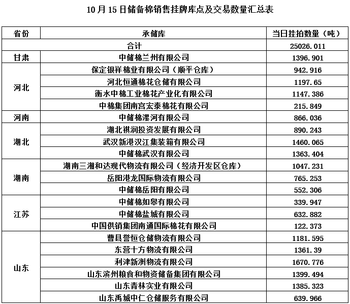 中國儲備棉管理有限公司定于10月15日通過全國棉花交易市場上市銷售中央儲備棉重量25026.011噸,共117捆。具體庫點及數(shù)量見下表。