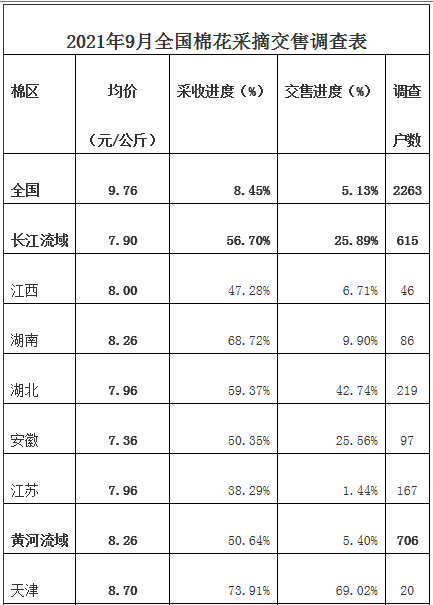 2021年9月,中國棉花協(xié)會棉農分會對全國12個省市自治區(qū)2263個定點農戶進行棉花產量、采摘、交售情況的調查,結果顯示:2021年度全國棉花產量預測為583.4萬噸,與上期相同,新疆棉區(qū)受冷空氣影響,部分區(qū)域出現(xiàn)降水,局部有雨夾雪,集中采棉時間推遲,采摘進度慢于去年;長江流域天氣適宜,棉花采摘進度明顯快于去年同期;黃河流域受降雨天氣影響,采摘進度明顯慢于去年同期。