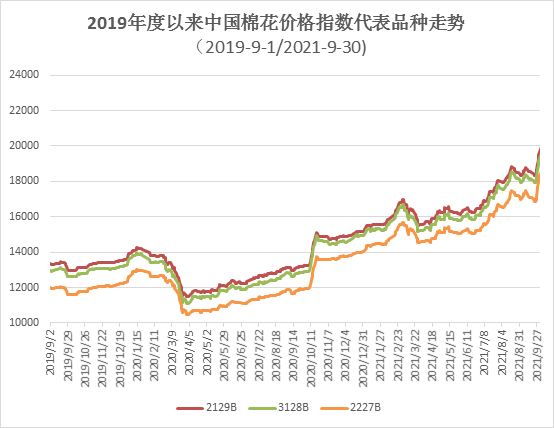 9月,儲備棉輪出成交活躍,成交率100%。國內(nèi)鄭棉期貨大幅上漲到20000元/噸以上,帶動皮棉現(xiàn)貨價格上漲至2014年以來新高。月末,中國棉花價格指數(shù)(CCIndex3128B)19104元/噸,環(huán)比上漲977元;月均價18237元/噸,環(huán)比上漲221元,同比上漲5441元。