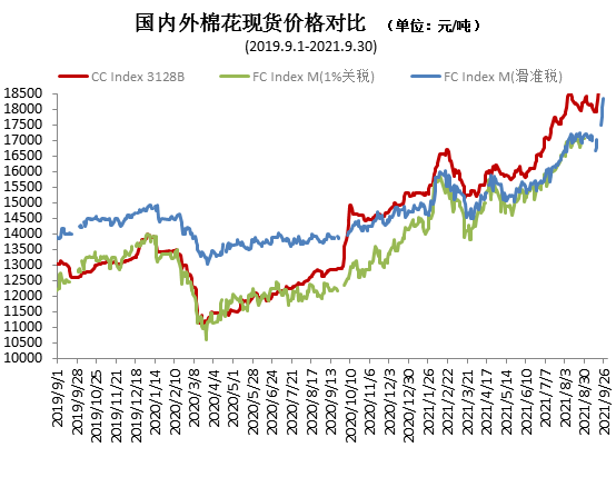 9月,國際棉花期現(xiàn)貨價格總體大幅上漲,但均價仍低于國內(nèi)棉價。中國進口棉價格指數(shù)FCIndexM月均為107.15美分/磅,環(huán)比上漲2.1美分;月底為114.49美分/磅,環(huán)比上漲7.49美分,1%關稅下折人民幣18238元/噸,低于同期國內(nèi)現(xiàn)貨866元,內(nèi)外棉價差較上月末縮小224元。