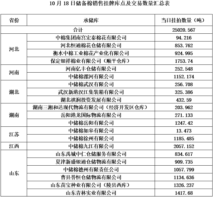 中國儲備棉管理有限公司定于10月18日通過全國棉花交易市場上市銷售中央儲備棉重量25020.567噸,共122捆。具體庫點及數量見下表。
