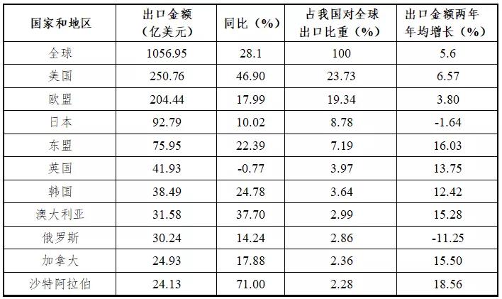 表1.2021年1-8月我國對部分國家和地區(qū)出口服裝情況