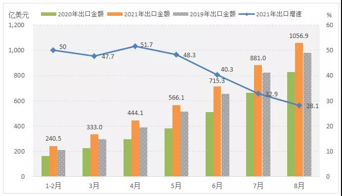 在國際市場需求回暖和海外訂單回流等因素的拉動下,我國服裝出口延續(xù)2020年下半年以來快速恢復(fù)態(tài)勢保持大幅增長。據(jù)中國海關(guān)數(shù)據(jù),2021年1-8月我國累計完成服裝及衣著附件出口1056.95億美元,同比增長28.1%,2年平均增長5.6%。服裝出口增速逐月放緩,8月單月增幅為8.7%,市場需求增長速度逐步回歸常態(tài)化。