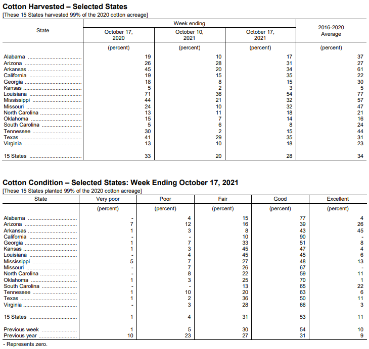 美國農(nóng)業(yè)部10月18日發(fā)布的美國棉花生長報告顯示,截至10月17日當(dāng)周,美棉吐絮率為86%,前周為78%,去年同期為93%,五年均值為88%。美棉收割率為28%,前周為20%,去年同期為33%,五年均值為34%。美棉生長優(yōu)良率為64%,前周為64%,去年同期為40%。