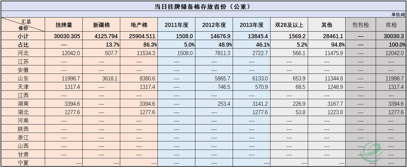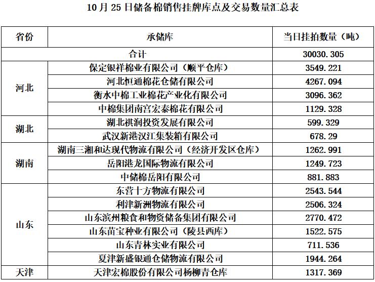 中國儲(chǔ)備棉管理有限公司定于10月25日通過全國棉花交易市場(chǎng)上市銷售中央儲(chǔ)備棉重量30030.305噸,共111捆。具體庫點(diǎn)及數(shù)量見下表。