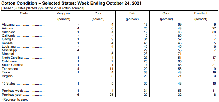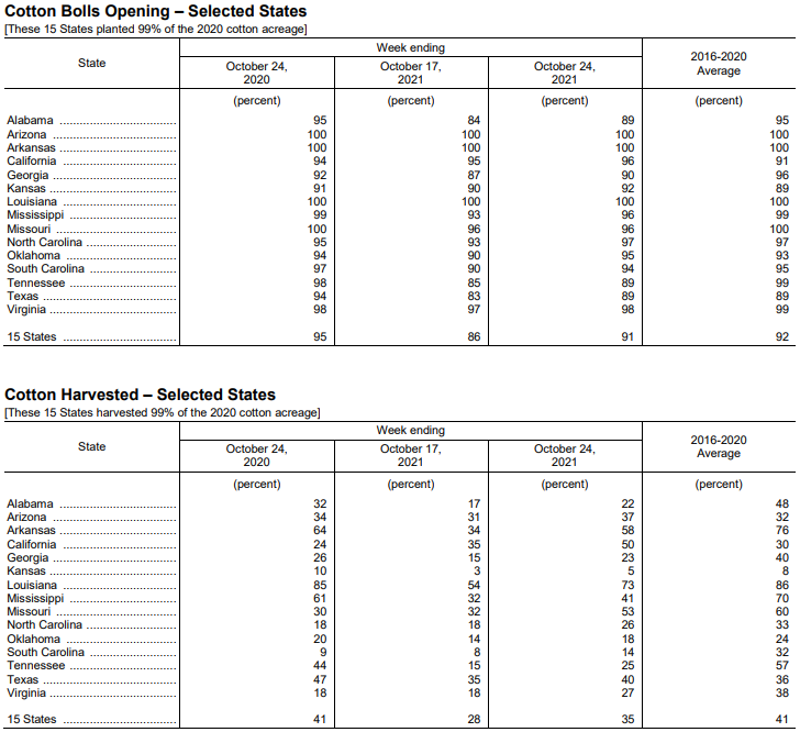 美國農業(yè)部10月25日發(fā)布的美國棉花生長報告顯示,截至10月24日當周,美棉吐絮率為91%,前周為86%,去年同期為95%,五年均值為92%。美棉收割率為35%,前周為28%,去年同期為41%,五年均值為41%。美棉生長優(yōu)良率為64%,前周為64%,去年同期為40%。
