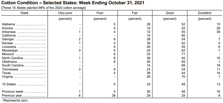 美國農(nóng)業(yè)部11月1日發(fā)布的美國棉花生長報告顯示,截至10月31日當周,美棉吐絮率為94%,前周為91%,去年同期為98%,五年均值為95%。美棉收割率為45%,前周為35%,去年同期為51%,五年均值為48%。美棉生長優(yōu)良率為62%,前周為64%,去年同期為37%。