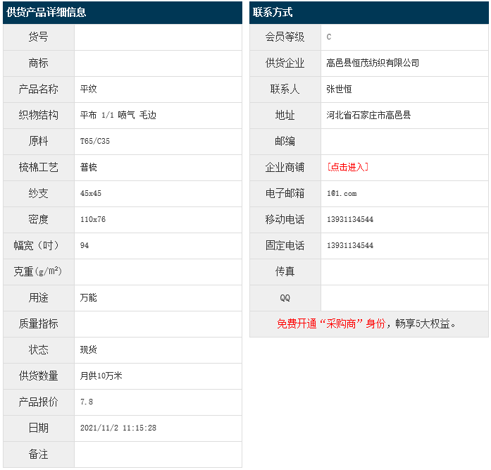 11月2日,高邑縣恒茂紡織有限公司滌棉平紋T65/C35 45x45 110x76 94" 1/1 噴氣 毛邊,報(bào)價(jià)為7.8元/米,實(shí)際成交價(jià)以協(xié)商為準(zhǔn)。[點(diǎn)擊查看詳情]