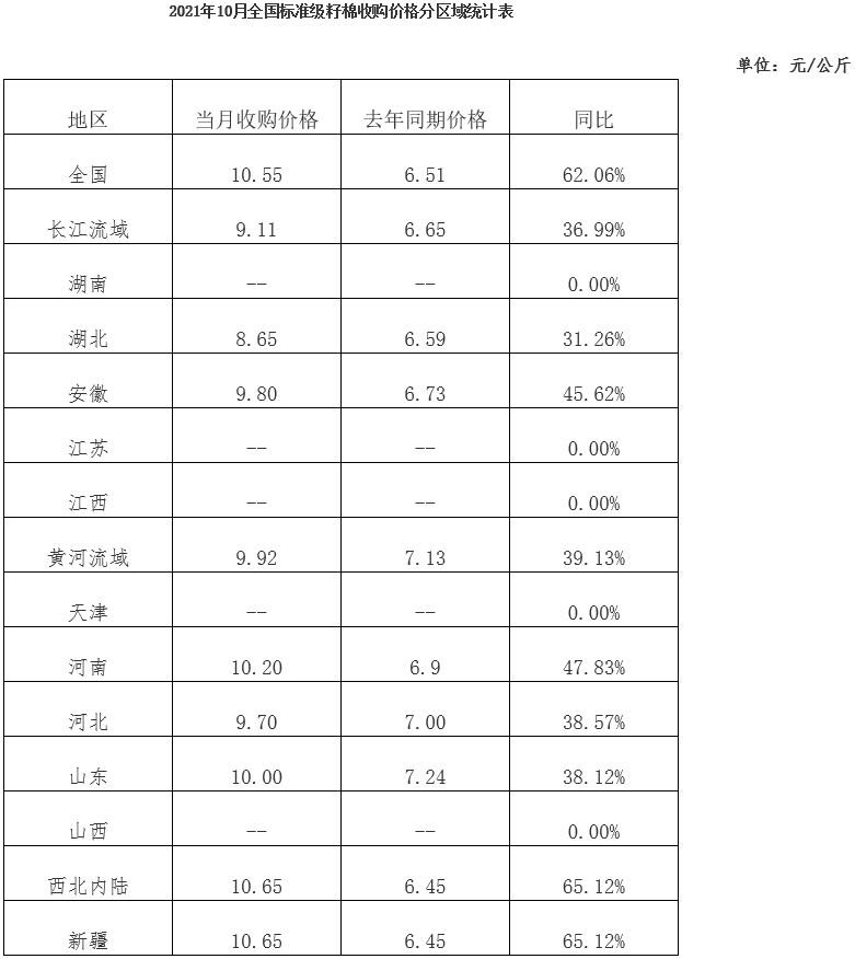 10月進入棉花采收、加工旺季。籽棉收購價受期、現(xiàn)貨價格上漲的影響高位運行,價格遠(yuǎn)超去年同期。據(jù)統(tǒng)計,10月全國400型棉花加工企業(yè)3128級籽棉平均收購價10.6元/公斤,同比上漲62.1%,環(huán)比上漲10.4%。新疆籽棉收購價10.7元/公斤,同比上漲65.1%,環(huán)比上漲10.9%。長江流域籽棉收購價9.1元/公斤,同比上漲36.0%,環(huán)比上漲4.1%;黃河流域收購價9.9元/公斤,同比上漲39.1%,環(huán)比上漲6.8%。國慶節(jié)期間,新疆地區(qū)籽棉開始大規(guī)模上市,個別加工企業(yè)高成本搶收資源,大部分軋花廠則擔(dān)心風(fēng)險,謹(jǐn)慎收購。隨著國家有關(guān)部門進一步調(diào)控市場,中旬以后收購價有所回落。月底北疆棉花收購進入尾聲,南疆采棉機緊缺導(dǎo)致可交售資源偏少,預(yù)計11月北疆采棉機南下后,情況將得以好轉(zhuǎn)。