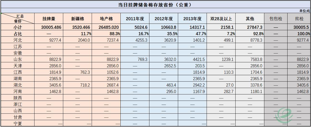 中國(guó)儲(chǔ)備棉管理有限公司定于11月5日通過(guò)全國(guó)棉花交易市場(chǎng)上市銷售中央儲(chǔ)備棉重量30005.486噸,共106捆。具體庫(kù)點(diǎn)及數(shù)量見(jiàn)下表。