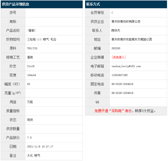 11月8日,青州華青紡織有限公司大化滌棉三粒格T65/C35 21x16 104x54 63" 1/1 噴氣 毛邊,報價為7.8元/米,實際成交價以協(xié)商為準(zhǔn)。[點擊查看詳情]