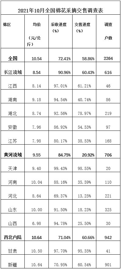 10月底,中國棉花協(xié)會棉農(nóng)分會對全國12個省市自治區(qū)及新疆生產(chǎn)建設(shè)兵團2264個定點農(nóng)戶進行棉花采摘交售情況的調(diào)查。調(diào)查結(jié)果顯示:受不利天氣影響,新疆和黃河流域棉區(qū)采摘和交售有所延后,進度均慢于去年。截至10月31日,全國采摘進度為72.4%,同比慢19.4個百分點;交售進度為58.9%,同比慢26.6百分點。籽棉交售價在國慶節(jié)期間持續(xù)上漲,中下旬有所回落,當(dāng)月全國棉花平均交售價10.5元/公斤,同比上漲63.7%。