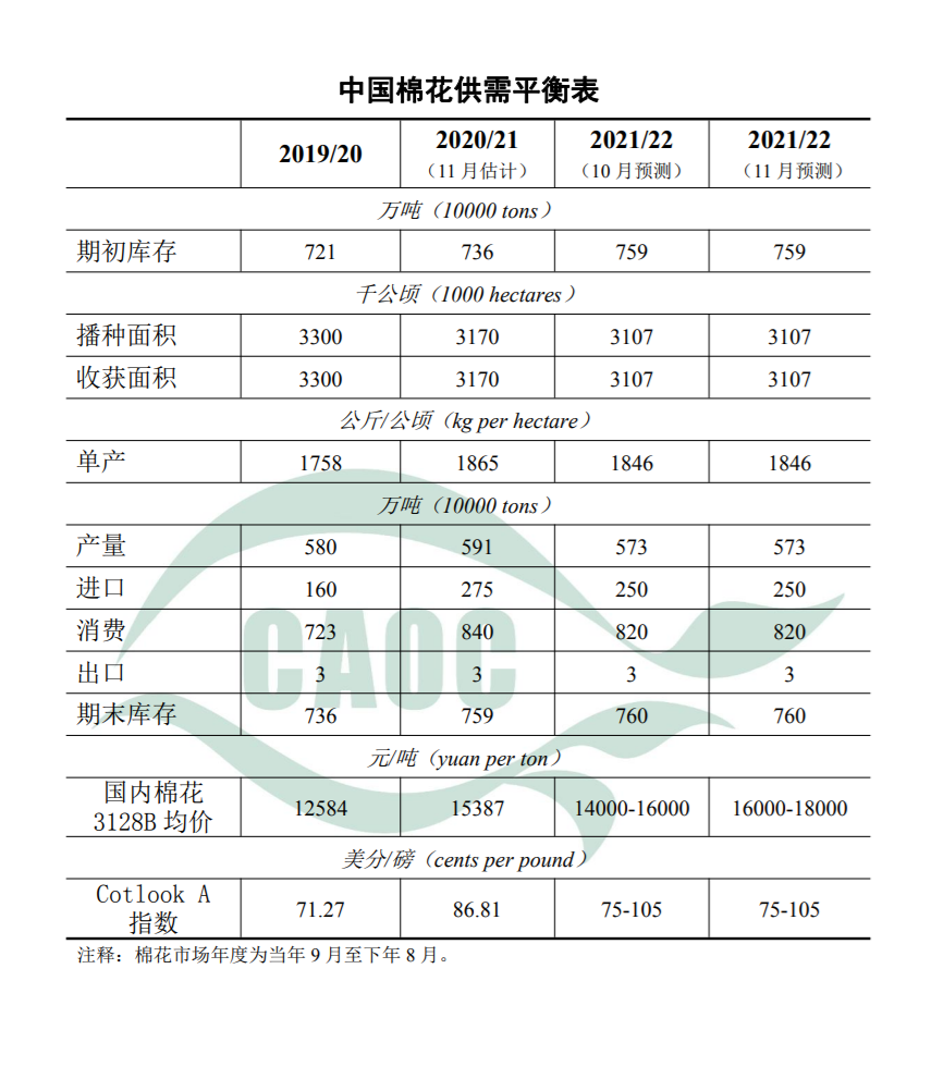 2021/22年度棉花進(jìn)入采摘收尾階段,全國大部氣象條件總體利于棉花采收。截至11月5日,全國新棉采摘進(jìn)度為82.8%,同比下降3.5個(gè)百分點(diǎn),其中新疆棉采摘進(jìn)度為82.6%,同比下降4.8個(gè)百分點(diǎn)。本月預(yù)測(cè),2021/22年度棉花產(chǎn)量573萬噸,進(jìn)口量250萬噸,消費(fèi)量820萬噸,供需基本平衡,與上月預(yù)測(cè)保持一致。隨著新棉規(guī)模上市和中央儲(chǔ)備棉持續(xù)投放,市場供給增加,后期棉花價(jià)格震蕩回調(diào)可能性較大。國際方面,北半球各主產(chǎn)國棉花總體長勢(shì)正常,美國、巴基斯坦、西非等國家和地區(qū)棉花產(chǎn)量較上年增加,全球棉花供需緊平衡格局略有緩和,國際棉價(jià)仍在每磅75-105美分的預(yù)測(cè)區(qū)間震蕩。
