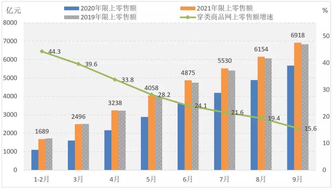 網(wǎng)絡(luò)零售增勢(shì)略好于實(shí)體,對(duì)服裝內(nèi)銷市場(chǎng)的拉動(dòng)作用持續(xù)顯現(xiàn)。據(jù)國(guó)家統(tǒng)計(jì)局?jǐn)?shù)據(jù),2021年1-9月穿類商品網(wǎng)上零售額同比增長(zhǎng)15.6%,增速比上年同期提高12.3個(gè)百分點(diǎn),比1-6月回落8.5個(gè)百分點(diǎn),2年平均增長(zhǎng)9.3%。
