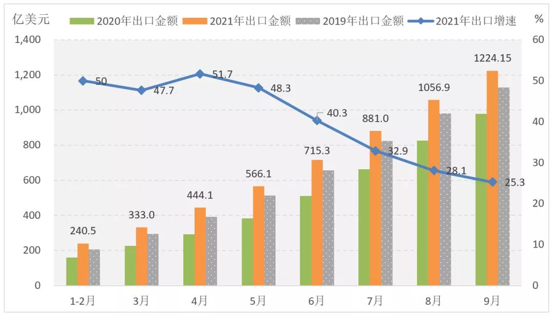 在國(guó)際市場(chǎng)需求回暖和海外訂單回流等因素的拉動(dòng)下,憑借強(qiáng)韌的產(chǎn)業(yè)鏈優(yōu)勢(shì),我國(guó)服裝出口保持大幅增長(zhǎng),但出口增速逐月放緩,9月單月增幅為9.9%,除上年同期基數(shù)抬高的因素,也顯示市場(chǎng)需求增長(zhǎng)速度正在逐步回歸常態(tài)化。據(jù)中國(guó)海關(guān)數(shù)據(jù),2021年1-9月我國(guó)累計(jì)完成服裝及衣著附件出口1224.15億美元,同比增長(zhǎng)25.3%,2年平均增長(zhǎng)6.0%。從服裝出口品類看,針織服裝及衣著附件出口增長(zhǎng)強(qiáng)勁,出口金額為612.23億美元,同比增長(zhǎng)40.57%,2年平均增長(zhǎng)7.0%;機(jī)織服裝及衣著附件出口增勢(shì)較弱,金額為501.99億美元,同比增長(zhǎng)8.47%,2年平均微增0.28%。