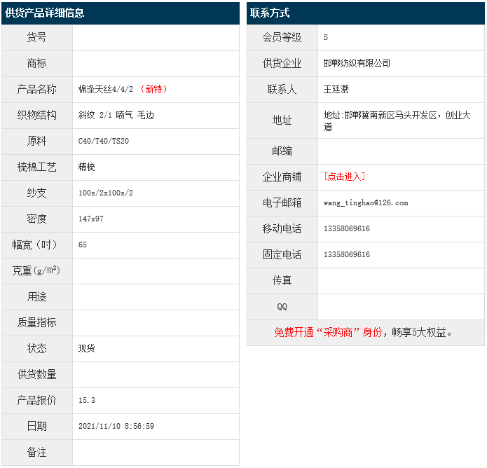 11月10日,邯鄲紡織有限公司棉滌天絲斜紋布JC40/T40/TS20 100/2x100/2 147x97 65" 2/1 噴氣 毛邊,報價為15.3元/米,實際成交價以協(xié)商為準。[點擊查看詳情]