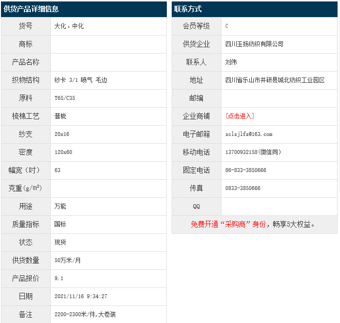 11月16日,四川玉揚(yáng)紡織有限公司大化滌棉紗卡T65/C35 20x16 120x60 63" 3/1 噴氣 毛邊,報價為9.1元/米,實際成交價以協(xié)商為準(zhǔn)。[點擊查看詳情]