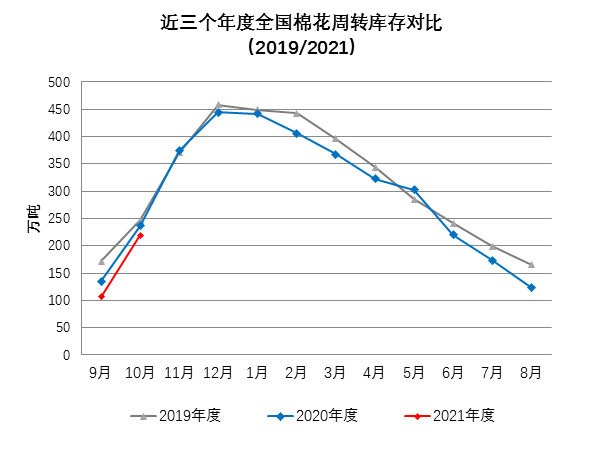 10月,儲備棉投放繼續(xù)進行,新疆及內(nèi)地新棉大量上市,市場資源量大幅增加,紡織企業(yè)開機率不足,新增訂單較少,棉花需求依然較弱,月內(nèi)國內(nèi)棉花周轉(zhuǎn)庫存環(huán)比大幅增加。據(jù)中國棉花協(xié)會棉花物流分會對全國棉花交易市場18個省市的154家棉花交割和監(jiān)管倉庫的調(diào)查數(shù)據(jù)顯示,10月底全國棉花周轉(zhuǎn)庫存總量約219.11萬噸,環(huán)比增加112.42萬噸,增幅較上月擴大,低于去年同期17.93萬噸。