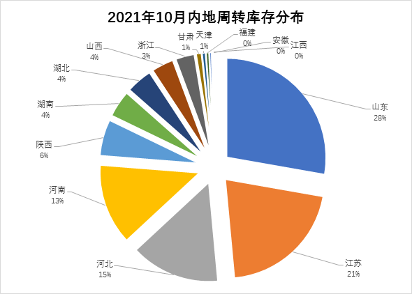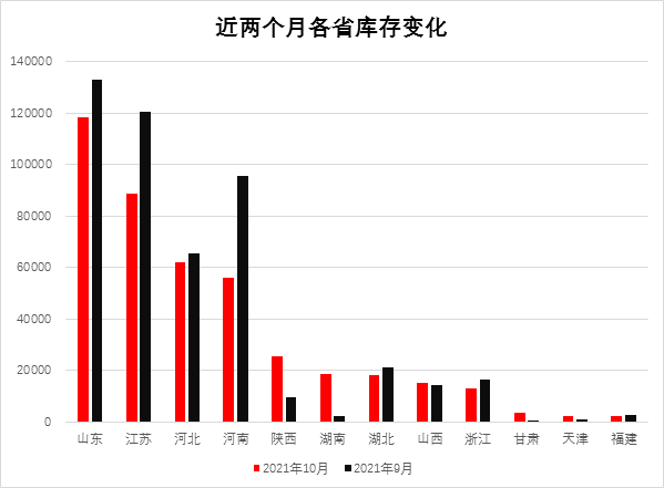 分省份看,山東省庫存量居首位為11.84萬噸,江蘇省次之為8.85萬噸,河北省居第三位為6.2萬噸,河南省為5.62萬噸,陜西省為2.53萬噸,湖南省1.85萬噸,湖北省1.81萬噸,山西省為1.53,浙江省為1.30;其他省均在1萬噸以下。