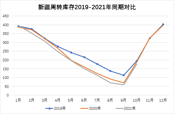 截至10月底,新疆43家倉庫商品棉周轉(zhuǎn)庫存為176.46萬噸,環(huán)比增加118.21萬噸,降幅環(huán)比大幅擴大。同比下降11.82萬噸。