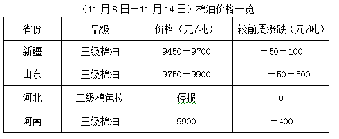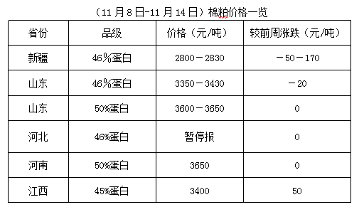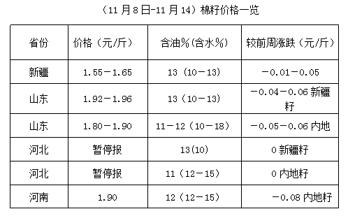 上周(11月8-14日),豆油、豆粕期貨震蕩調(diào)整,豆油先行回落,后止跌反彈,豆粕低位止跌反彈,現(xiàn)貨行情弱勢難穩(wěn),拖累棉籽價(jià)格上半周持續(xù)下跌,后半周價(jià)格止跌略有反彈,棉副產(chǎn)品整體行情不佳,報(bào)價(jià)略顯混亂,整體出貨量少,油棉廠經(jīng)營困難加劇,市場開工率提升有限。未來棉籽和棉副產(chǎn)品行情仍難穩(wěn)定,油棉經(jīng)營可謂步履維艱,原料采購和產(chǎn)品行情掌控難度將進(jìn)一步加大。