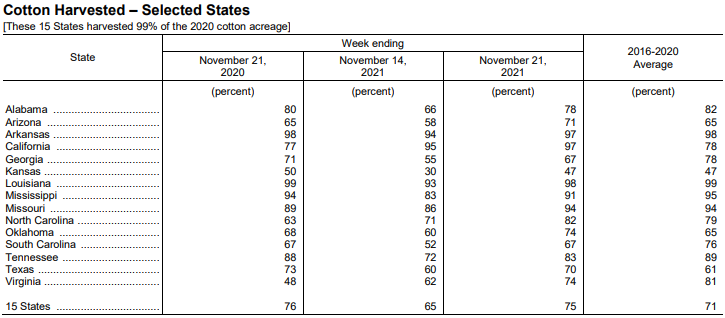 美國農(nóng)業(yè)部11月22日發(fā)布的美國棉花生長報告顯示,截至11月21日當周,美棉收割率為75%,前周為65%,去年同期為76%,五年均值為71%。