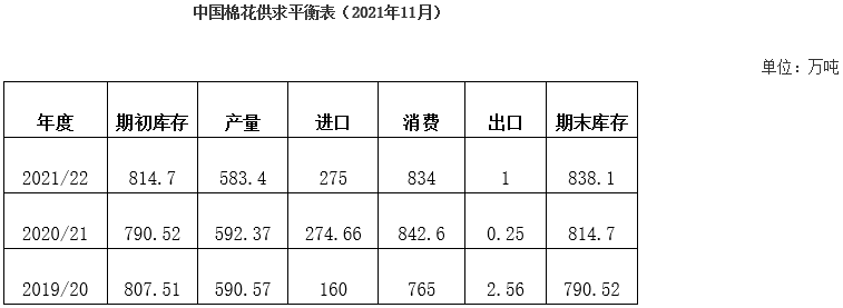 據(jù)中國棉花協(xié)會預(yù)測,2021/22年度全國棉花總產(chǎn)583.4萬噸,同比下降1.52%;消費(fèi)量834萬噸,同比下降1.02%,較上期調(diào)減9萬噸;進(jìn)口量為275萬噸;期末庫存相應(yīng)調(diào)整為838.1萬噸,同比增長2.87%,較上期調(diào)增9萬噸。
