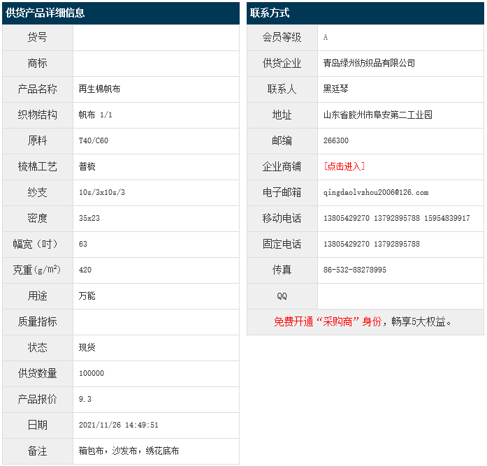 11月26日,青島綠州紡織品有限公司再生棉帆布CVC60/40 10/3x10/3 35x23 63" 1/1 420g/㎡,報價為9.3元/米,實際成交價以協(xié)商為準(zhǔn)。[點擊查看詳情]