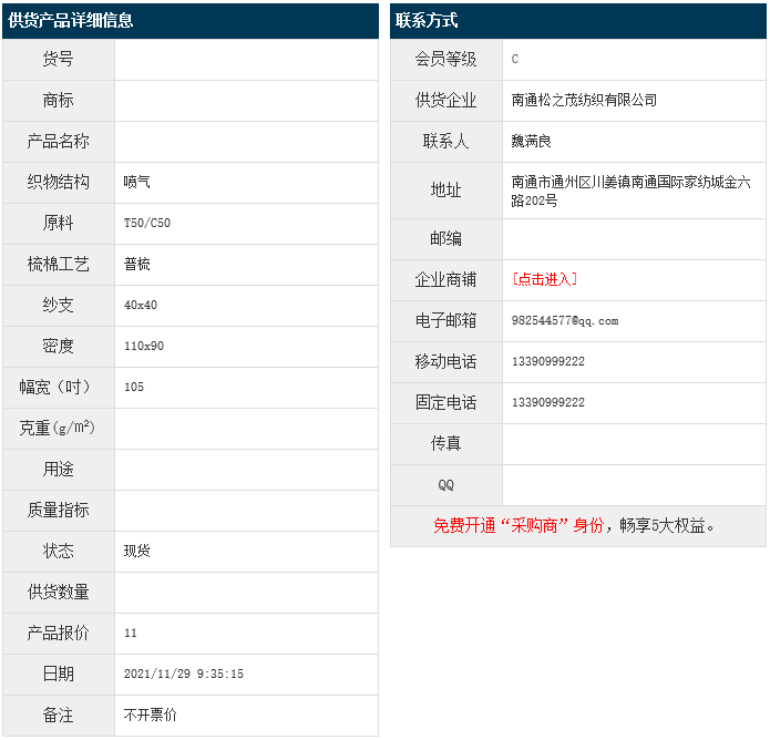 11月29日,南通松之茂紡織有限公司滌棉布T50/C50 40x40 110x90 105" 噴氣,報價為11元/米,實際成交價以協(xié)商為準(zhǔn)。[點擊查看詳情]