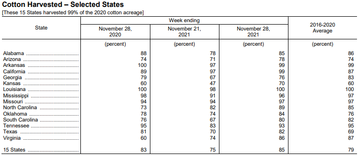 美國農(nóng)業(yè)部11月29日發(fā)布的美國棉花生長報告顯示,截至11月28日當(dāng)周,美棉收割率為85%,前周為75%,去年同期為83%,五年均值為79%。