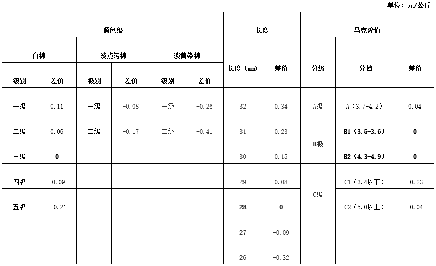 根據(jù)《中國棉花協(xié)會籽棉收購結(jié)算差價參考表(新疆細絨棉)管理辦法》規(guī)定,依據(jù)中國棉花協(xié)會發(fā)布的2021年12月《鋸齒加工細絨棉質(zhì)量差價表》和中國棉花預(yù)警系統(tǒng)2021年9月-11月新疆籽棉收購平均衣分率數(shù)據(jù),折算得出籽棉收購差價,現(xiàn)正式發(fā)布2021年12月《籽棉收購結(jié)算差價參考表(新疆細絨棉)》(單位:元/公斤),為新疆地區(qū)籽棉收購工作提供參考。