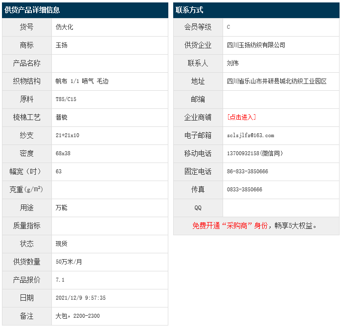 12月9日,四川玉揚紡織有限公司仿大化滌棉帆布T85/C15 21+21x10 68x38 63" 1/1 噴氣 毛邊,報價為7.1元/米,實際成交價以協(xié)商為準。[點擊查看詳情]