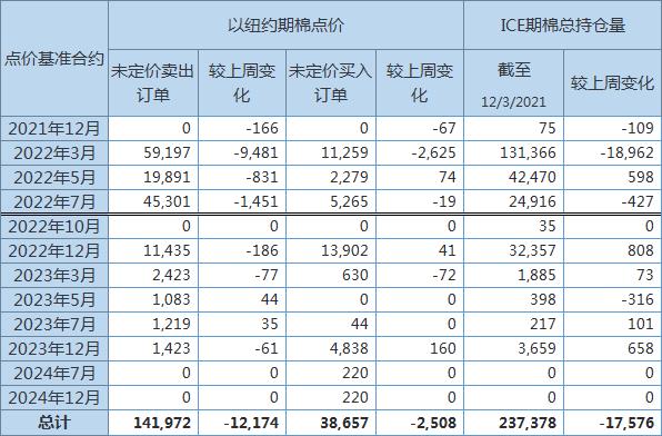 美國(guó)商品期貨交易委員會(huì)(CFTC)12月9日消息,截至12月3日,以ICE期棉2203合約點(diǎn)價(jià)未定價(jià)賣出訂單(Unfixed Call Sales)較此前一周減少9481手至59197手;以2021/22年度(8月至次年7月)合約點(diǎn)價(jià)未定價(jià)賣出訂單共124389手,環(huán)比降11929手。