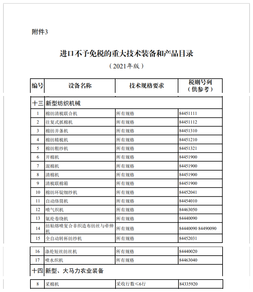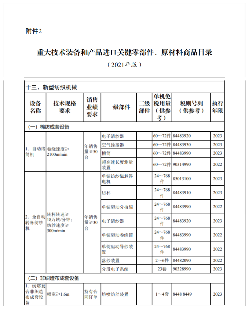 四、附件1和附件2中所列銷售業(yè)績要求僅用于確定免稅企業(yè)名單。附件2中列明執(zhí)行年限的進(jìn)口關(guān)鍵零部件、原材料,免稅執(zhí)行期限截至該年度12月31日(含)。附件2和附件3中所列稅則號列僅供參考,具體商品范圍以設(shè)備名稱及技術(shù)規(guī)格要求為準(zhǔn)。