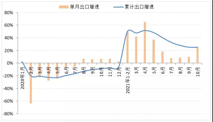 10月在國際市場需求增加和為圣誕季促銷備貨等因素的拉動下,我國服裝出口增速大幅加快,單月增速比上月提高14.8個百分點。根據(jù)中國海關(guān)數(shù)據(jù),2021年1-10月我國累計完成服裝及衣著附件出口1388.5億美元,同比增長25.2%,兩年平均增長7.0%,比1-9月加快1.0個百分點。其中針織服裝及衣著附件出口保持迅猛增長,出口金額為700.74億美元,同比增長40.27%,兩年平均增長8.4%;機(jī)織服裝及衣著附件出口穩(wěn)步恢復(fù),出口金額為569.18億美元,同比增長10.44%,兩年平均增長1.54%。