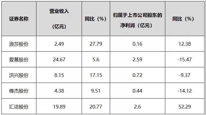 5家上市企業(yè)2021年前3季度營業(yè)收入為59.58億元,凈利潤6.51億元。從營收上看,愛慕股份以24.67億元位居首位,匯潔股份19.89億元,洪興股份、棒杰股份、浪莎股份營收在10億元以內(nèi);其中匯潔股份、浪莎股份的營收凈利潤實現(xiàn)雙增。