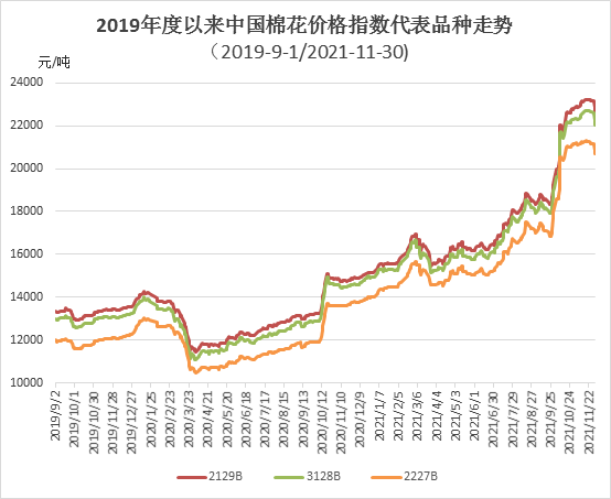 11月,受籽棉收購價逐步回落和國內(nèi)期貨價格下跌等因素影響,中國棉花價格指數(shù)(CCIndex3128B)在11月18日以22713元/噸創(chuàng)下近10年新高,之后開始回落,但同時受皮棉加工成本高企支撐,現(xiàn)貨價格高于期貨市場。月內(nèi)紡織企業(yè)棉紗等成品銷售依然較弱,原料采購以儲備棉和進口棉為主,皮棉現(xiàn)貨需求較弱。月末,中國棉花價格指數(shù)(CCIndex3128B)22544元/噸,環(huán)比上漲243元;月均價22538元/噸,環(huán)比上漲1090元,同比上漲8005元。