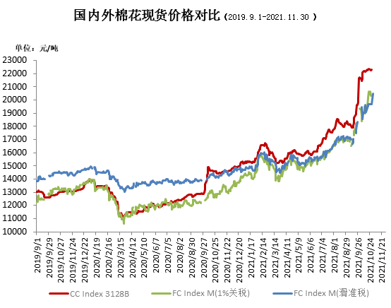 11月,國際棉花期現(xiàn)貨價格先漲后跌,均價較上月小幅上漲。中國進口棉價格指數(shù)FCIndexM月均130.92美分/磅,環(huán)比上漲9.42美分;月底126.82美分/磅,環(huán)比下跌0.63美分,1%關稅下折人民幣19920元/噸,低于同期國內(nèi)現(xiàn)貨2624元,內(nèi)外棉價差較上月末擴大472元。