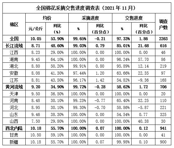 按照被調查棉農(nóng)預計產(chǎn)量及采摘量、交售量計算,截至11月30日,全國棉花采摘進度為99.7%,同比慢0.2個百分點;交售進度為97.3%,同比快1.9個百分點。全國棉花平均交售價10.1元/公斤,同比上漲53.9%,環(huán)比下跌4.7%。