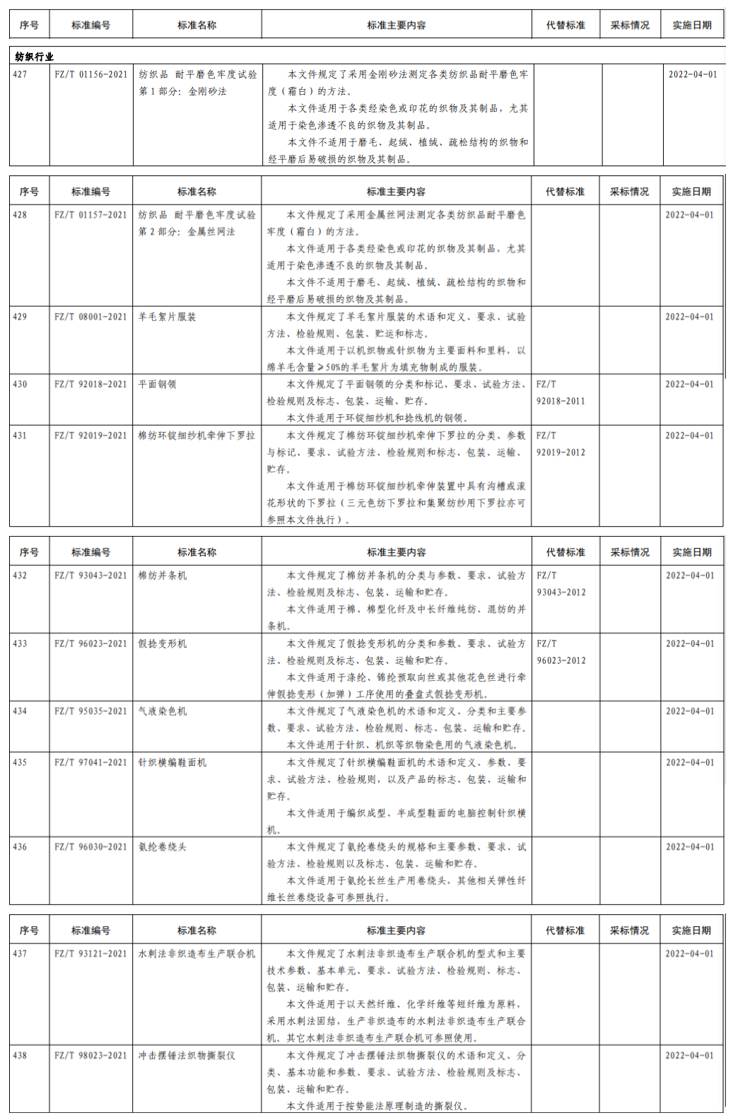 以上紡織行業(yè)標(biāo)準(zhǔn)由中國(guó)標(biāo)準(zhǔn)出版社出版、紡織行業(yè)計(jì)量技術(shù)規(guī)范由中國(guó)質(zhì)檢出版社出版。