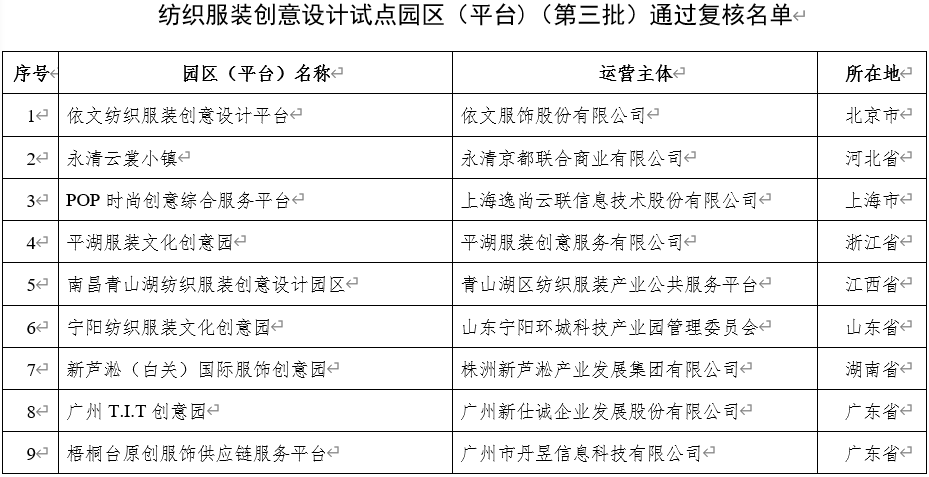 根據(jù)《工業(yè)和信息化部關(guān)于印發(fā)<紡織服裝創(chuàng)意設(shè)計試點示范園區(qū)(平臺)管理辦法(試行)>的通知》(工信部消費〔2016〕396號)要求,經(jīng)園區(qū)(平臺)自愿申報、省級工業(yè)和信息化主管部門推薦、專家評審和網(wǎng)上公示等程序,確定紡織服裝創(chuàng)意設(shè)計示范園區(qū)(平臺)名單(第一批)和紡織服裝創(chuàng)意設(shè)計試點園區(qū)(平臺)(第三批)通過復(fù)核名單?,F(xiàn)予公告。