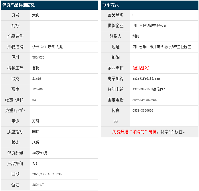 1月5日,四川玉揚(yáng)紡織有限公司大化滌棉紗卡T80/C20 21x16 120x60 63" 3/1 噴氣 毛邊,報價為7.3元/米,實(shí)際成交價以協(xié)商為準(zhǔn)。[點(diǎn)擊查看詳情]