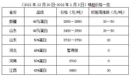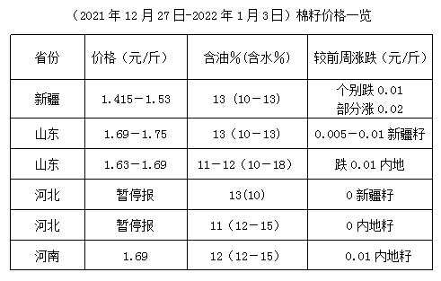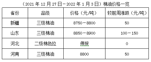 上周(2021年12月27日-2022年1月3日),豆油、豆粕期貨震蕩調(diào)整,棉油、棉粕走貨緩慢,棉籽價格企穩(wěn)止跌,個別地區(qū)價格有漲,油棉廠加工倒掛持續(xù),部分油棉廠提前放假停工,其余廠家堅持收購加工,表現(xiàn)波瀾不驚。