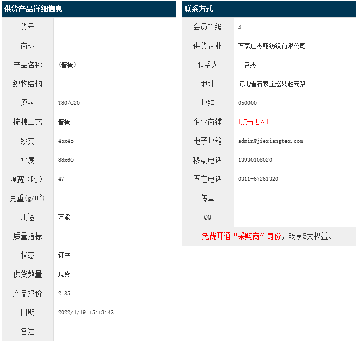 1月19日,石家莊杰翔紡織有限公司滌棉布T80/C20 45x45 88x60 47",報(bào)價(jià)為2.35元/米,實(shí)際成交價(jià)以協(xié)商為準(zhǔn)。[點(diǎn)擊查看詳情]