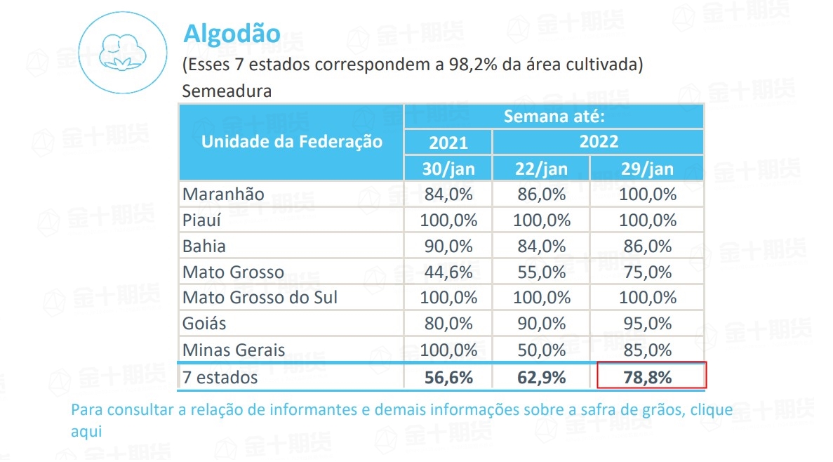 據(jù)巴西農(nóng)業(yè)部下屬的國(guó)家商品供應(yīng)公司CONAB,截至1月29日,巴西棉花播種率為78.8%,上周為62.9%,去年同期為56.6%。