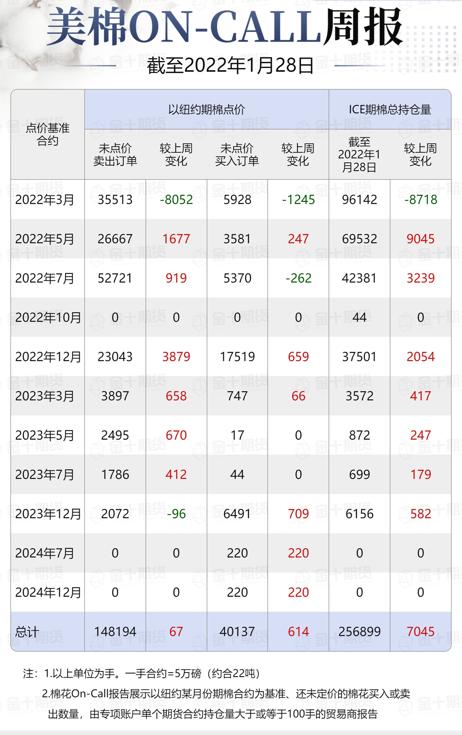 ①美棉On-Call未點(diǎn)價(jià)賣(mài)出訂單148194手,環(huán)比增加67手;未點(diǎn)價(jià)買(mǎi)入訂單40137手,環(huán)比增加614手;