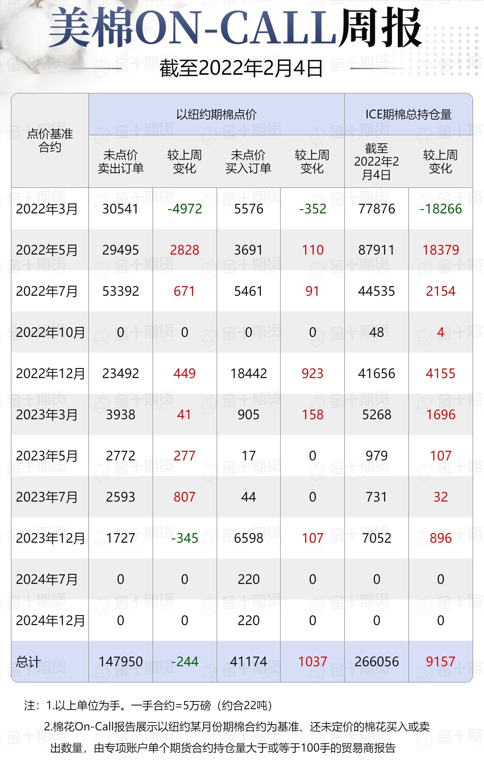 ①美棉On-Call未點(diǎn)價(jià)賣出訂單147950手,環(huán)比增加-244手;未點(diǎn)價(jià)買入訂單41174手,環(huán)比增加1037手;